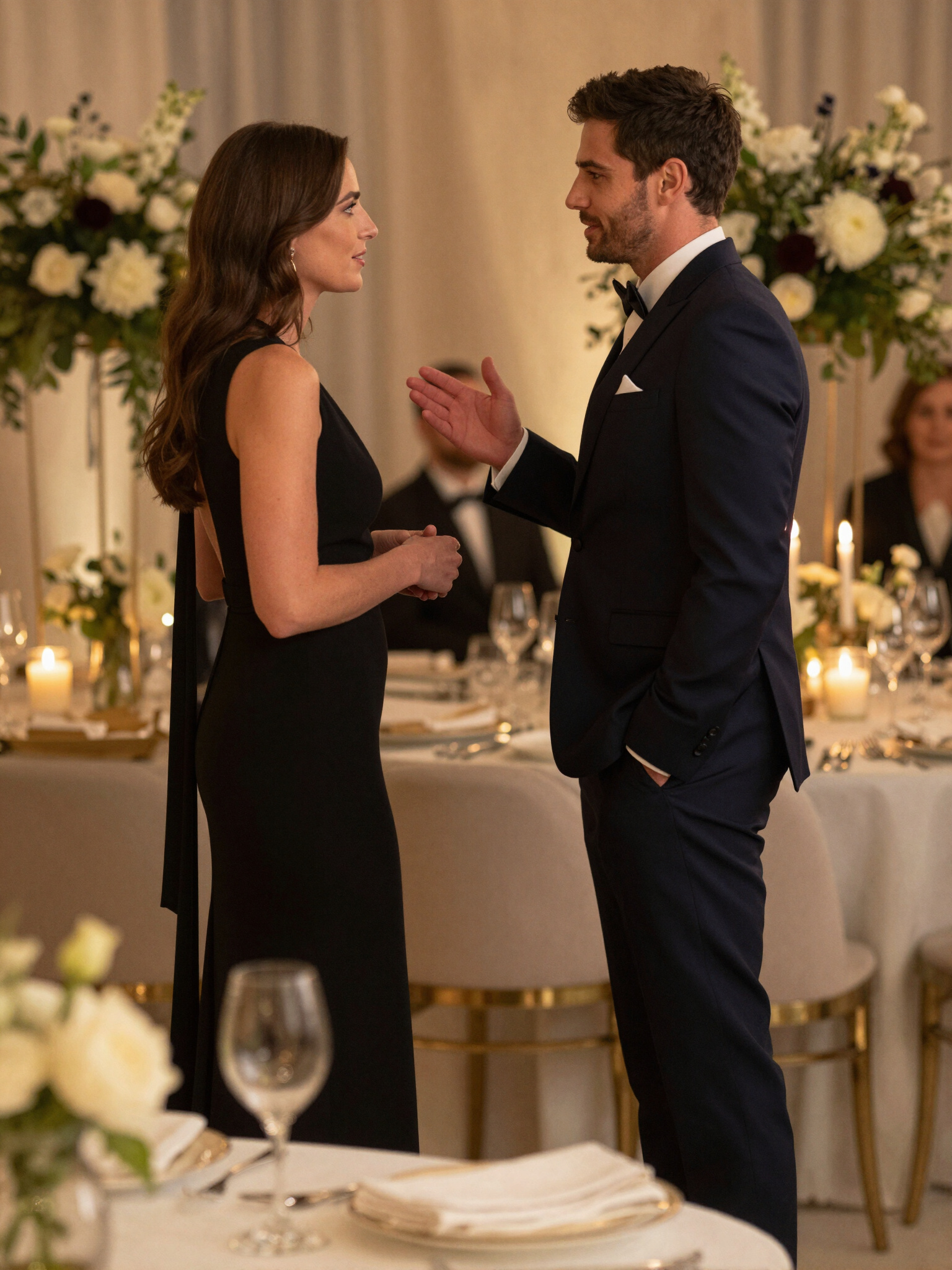 Bandeja con postres gourmet, personas en evento elegante.
